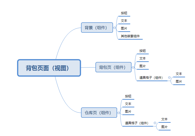 如果一个组件中包含了另一个组件,会导出对应的引用比如,背包中有背包分页和仓库分页,背包分页和仓库分页又会导出他们对应的UI文件,层层嵌套解耦。