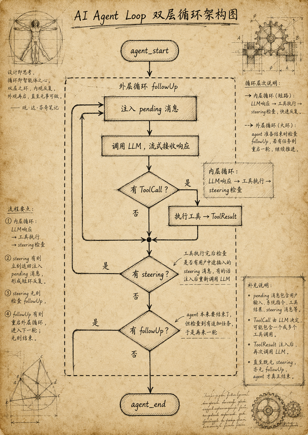结合起来看,内层循环处理 tool call 和 steering,外层循环处理 followUp。agent 只有在两层队列都为空时才会真正停止。